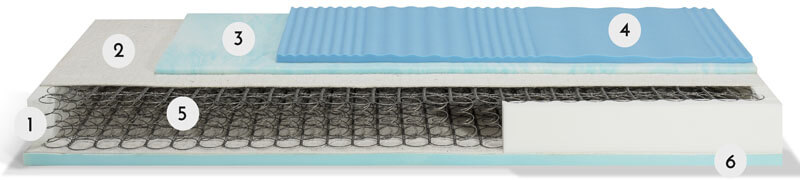 Alle Molle Bonnell viene abbinato un profilo costituito da un sandwich con lato di contatto in SensityMemory, in modo da donare un sostegno più omogeneo e comfortevole, e un lato con un lato di appoggio in Hidrocell rigido. La struttura interna particolarmente areata garantisce una ventilazione perfetta che crea un microclima salutare durante il riposo, oltre a fungere da naturale isolamento. La struttura è ben compatta grazie alla all’utilizzo di Hidrocell rigido nella parte perimetrale.