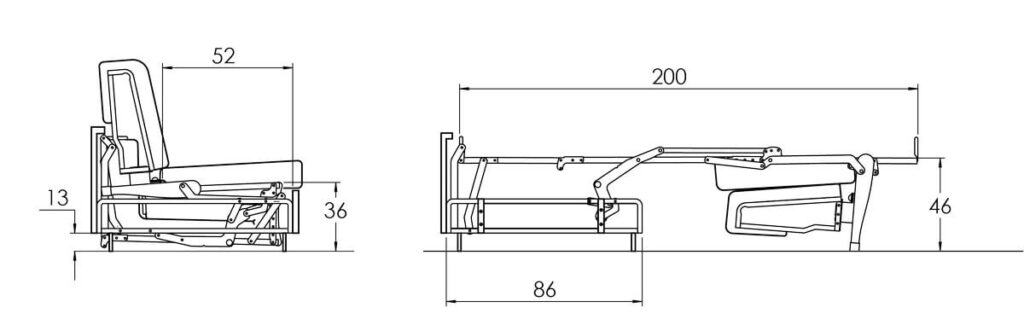 Meccanismo a ribalta con sistema di apertura semplice ed unico che consente di non rimuovere i cuscini dalla seduta e dello schienale. Progettato per la realizzazione di modelli con altezza piedi H 13 cm, per un design moderno.